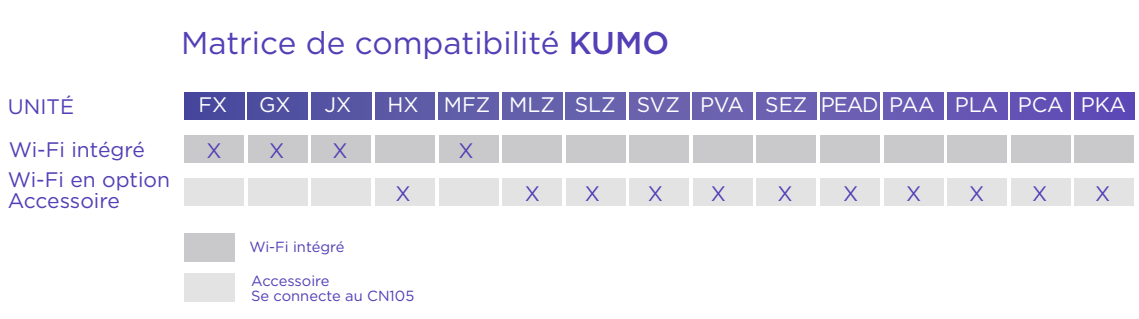 *Veuillez noter qu’une interface ou un accessoire est requis pour les unités sans Wi-Fi intégré. Pour les unités nécessitant l’interface PAC-USWHS002, veuillez consulter le manuel d’instructions Kumo pour obtenir les directives de configuration du Wi-Fi. Pour les unités avec Wi-Fi intégré, veuillez consulter le manuel d’utilisation de l’unité intérieure pour les instructions de configuration du Wi-Fi.