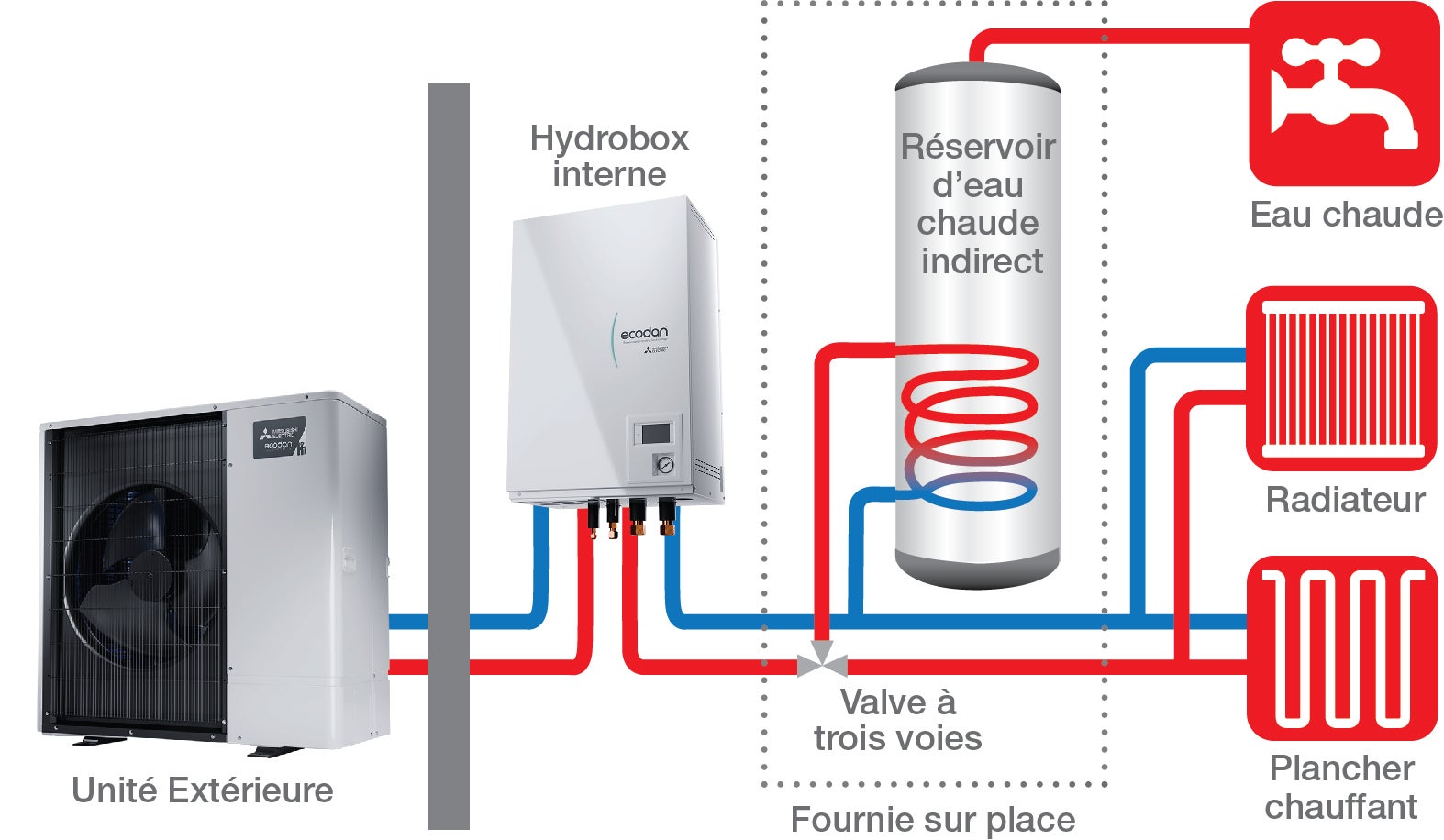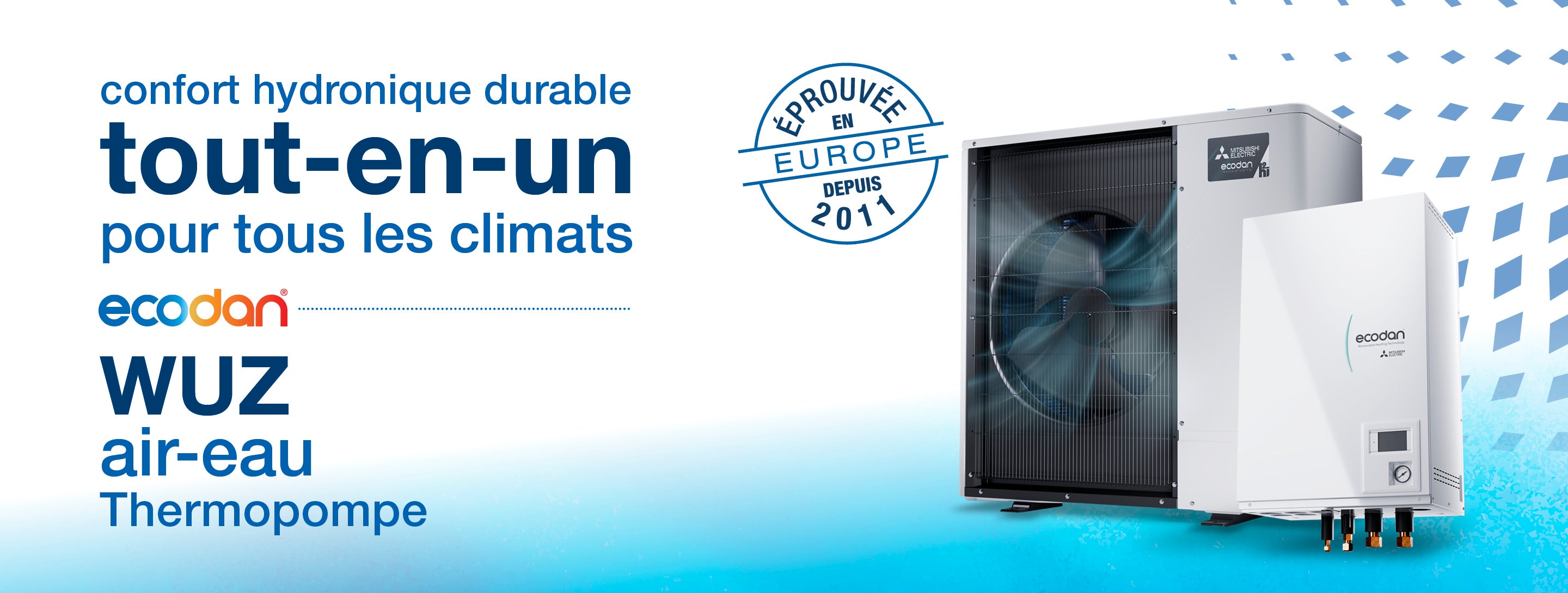 La thermopompe air-eau Ecodan WUZ de Mitsubishi Electric offre le chauffage hydronique, l’eau glacée pour la climatisation et la production d’eau chaude domestique. Éprouvée en Europe depuis 2011, l’Ecodan WUZ est désormais optimisée pour les climats les plus froids du Canada.  Son système au réfrigérant au R-32 à division de charge assure un rendement efficace de la thermopompe et un confort hydronique supérieur. En maintenant les circuits d’eau à l’intérieur, cette conception élimine le besoin de glycol ou de traçage de chaleur et réduit les coûts d’installation et d’entretien. Les composants intégrés et les options de tuyauterie flexibles simplifient davantage l’installation.